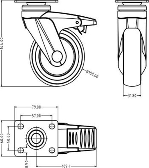 57系列腳輪主架和輪芯采用高強度聚酰胺制材質, 美觀,防腐,防生銹,轉動部分均采用精密滾珠軸承結構、轉動靈活靜音,承載性能好,保證了腳輪的使用壽命,輪胎面采用超靜音TPE材質注塑成型, 耐磨、耐沖擊、承載大整體靜音耐磨、轉動輕巧靈活,彈性好